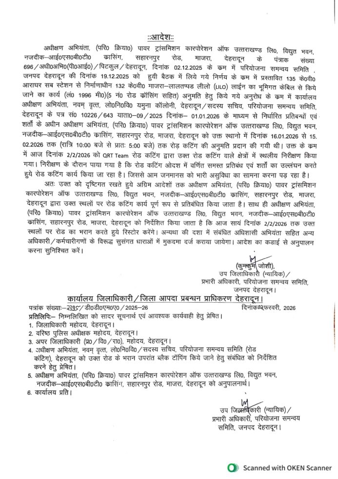 पावर ट्रांसमिशन कारपोरेशन ऑफ उत्तराखण्ड लिमिटेड (पिटकुल) द्वारा 135 केवी आराघर सब-स्टेशन से निर्माणाधीन 132 केवी माजरा-लालतप्पड़ एलआईएलओ लाइन को भूमिगत केबल के माध्यम से बिछाने हेतु कुल 1996 मीटर लंबाई में रोड कटिंग की अनुमति ली गई थी। यह अनुमति 16 जनवरी से 15 फरवरी 2026 तक रात्रि 10 बजे से प्रातः 5 बजे तक सशर्त प्रदान की गई थी।